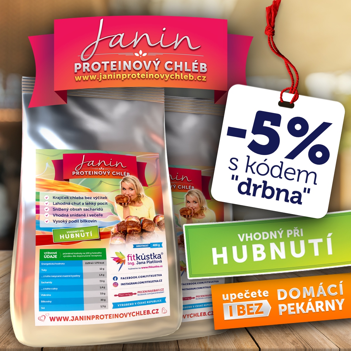 Směs si můžete objednat na janinproteinovychleb.cz, kde najdete i další podrobnosti. Po zadání kódu „drbna“ získáte 5% slevu. Ideální při hubnutí.