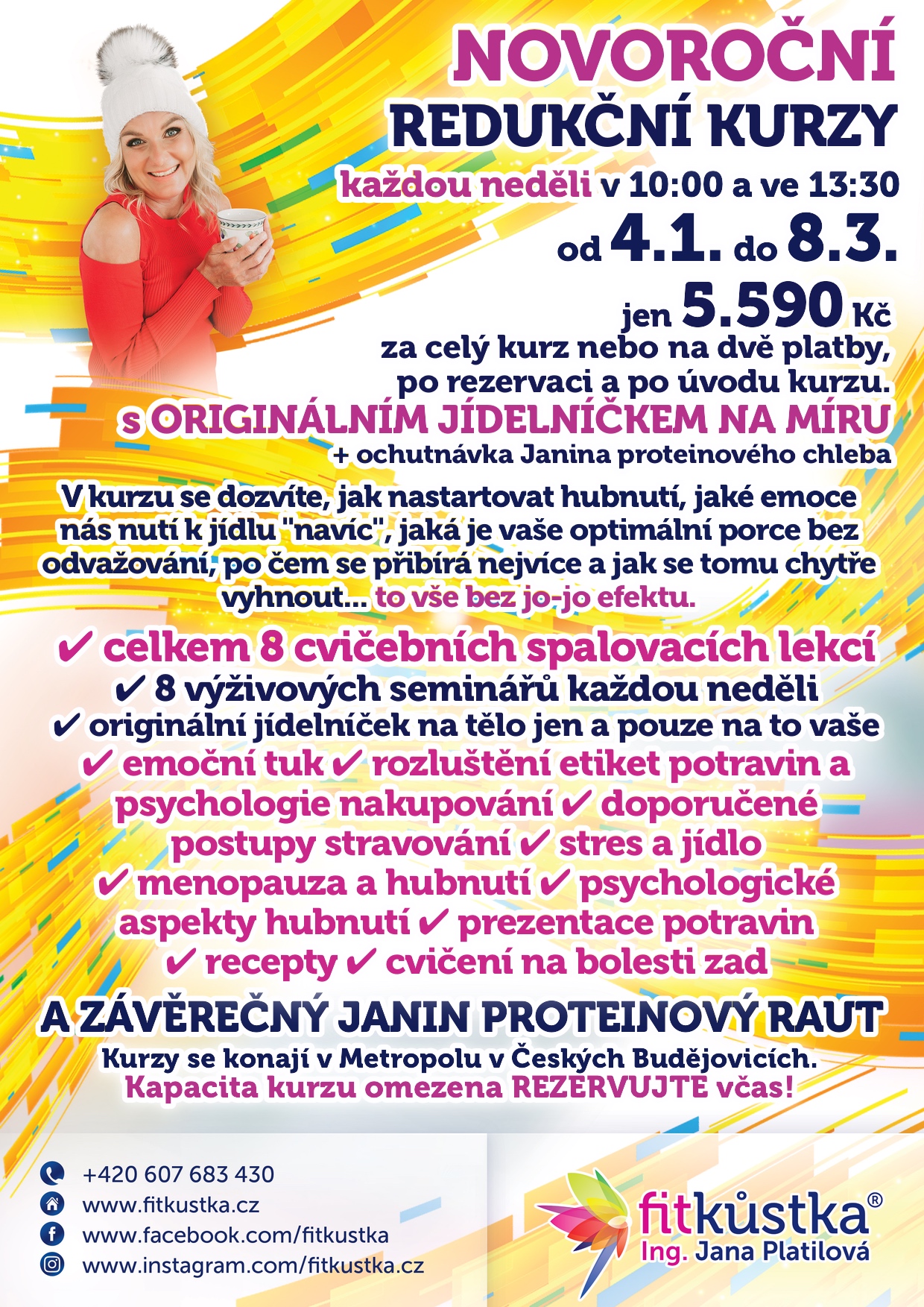 Fitkůstka pod vedením Jany dnes funguje jako komplexní program – od individuální péče až po skupinové kurzy zaměřené na redukci váhy. Kurzy probíhají každou neděli v Českých Budějovicích a spojují cvičení, vzdělávání a osobní vedení.