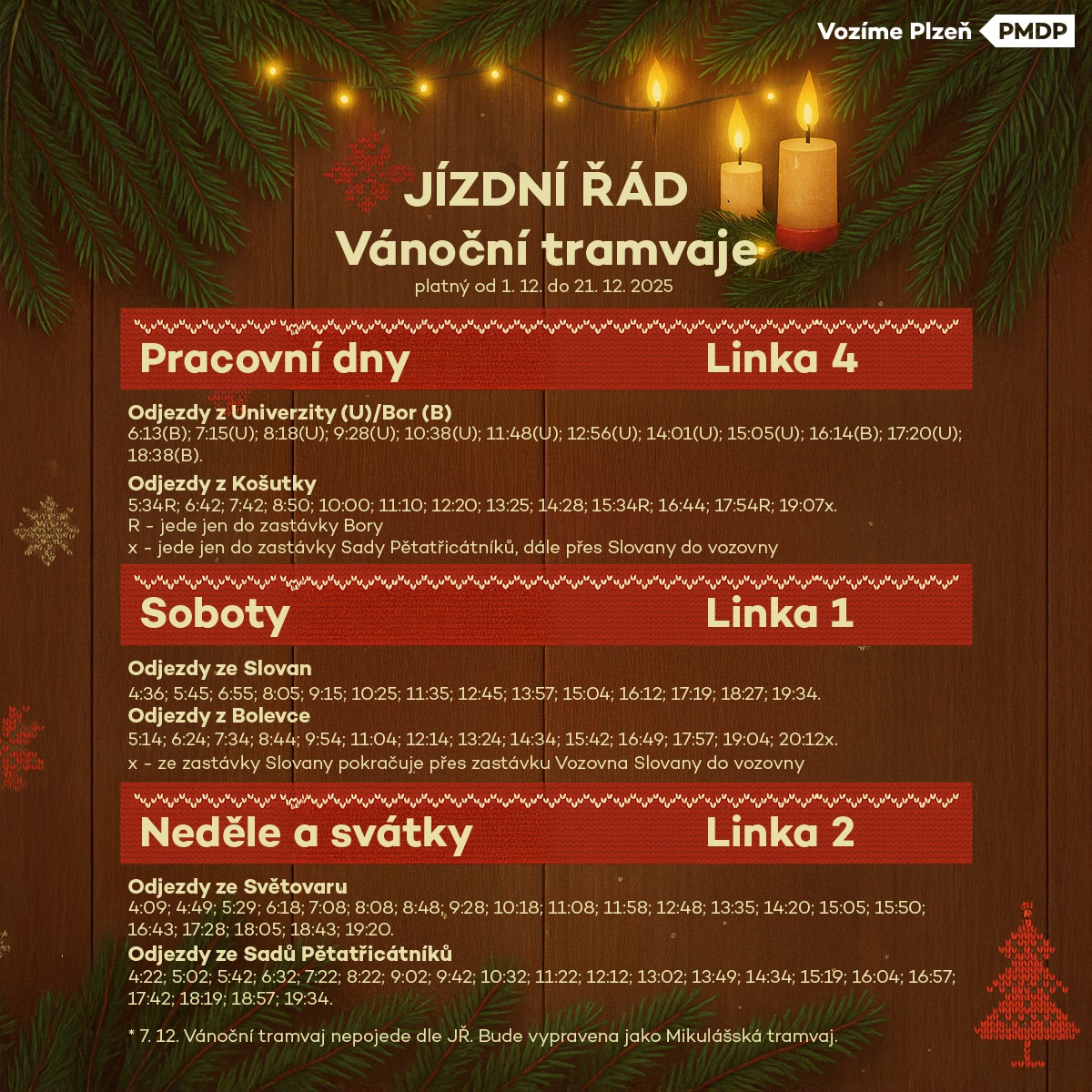 První speciální jízdy se uskutečnily v neděli 30. listopadu. V prosinci bude vánoční tramvaj jezdit pravidelně – v pracovních dnech na lince 4, o sobotách na lince 1 a o nedělích na lince 2. Po Plzni ji budete moci potkávat do 21. prosince.